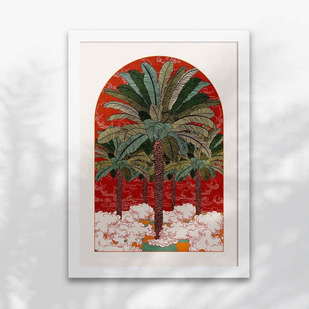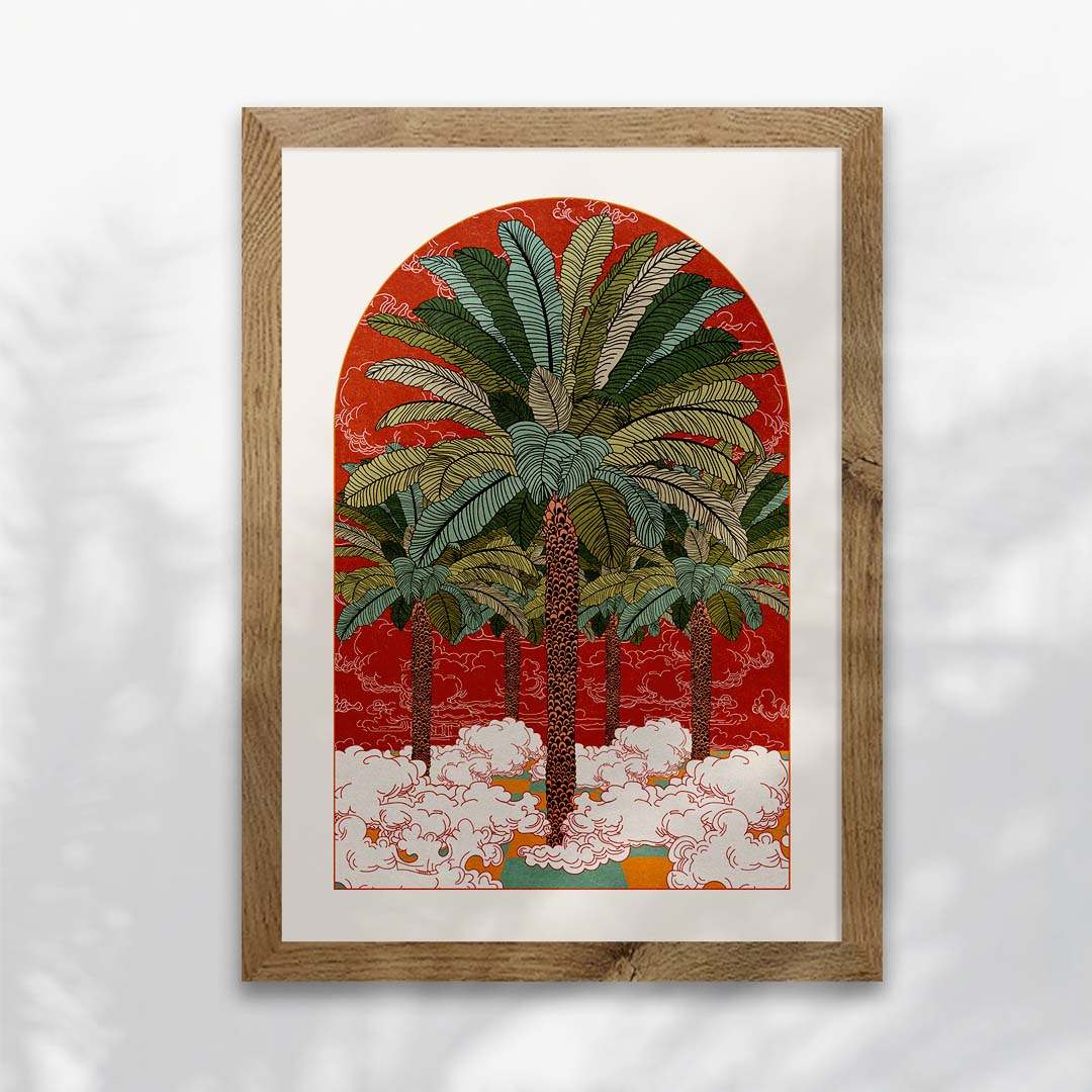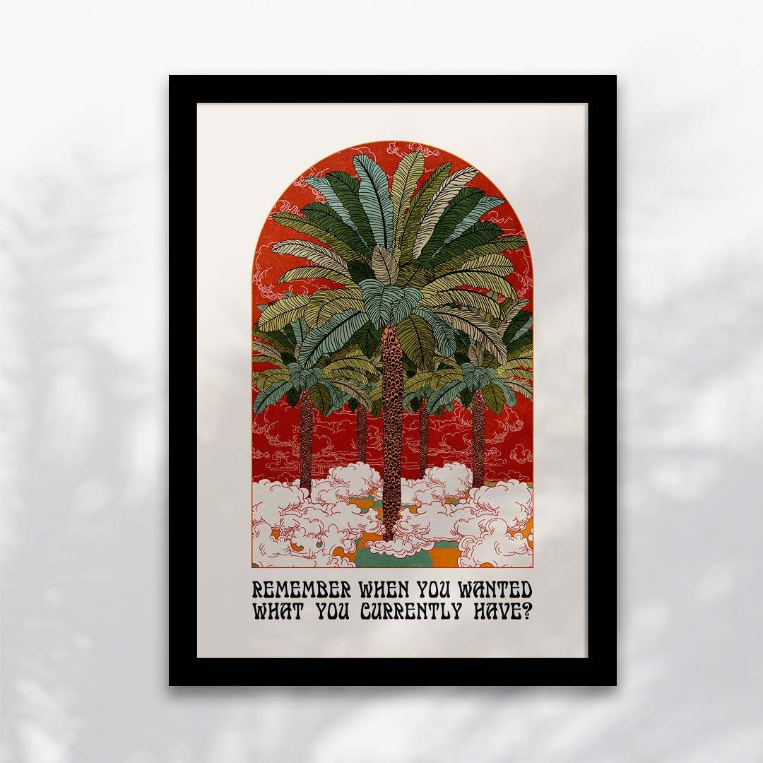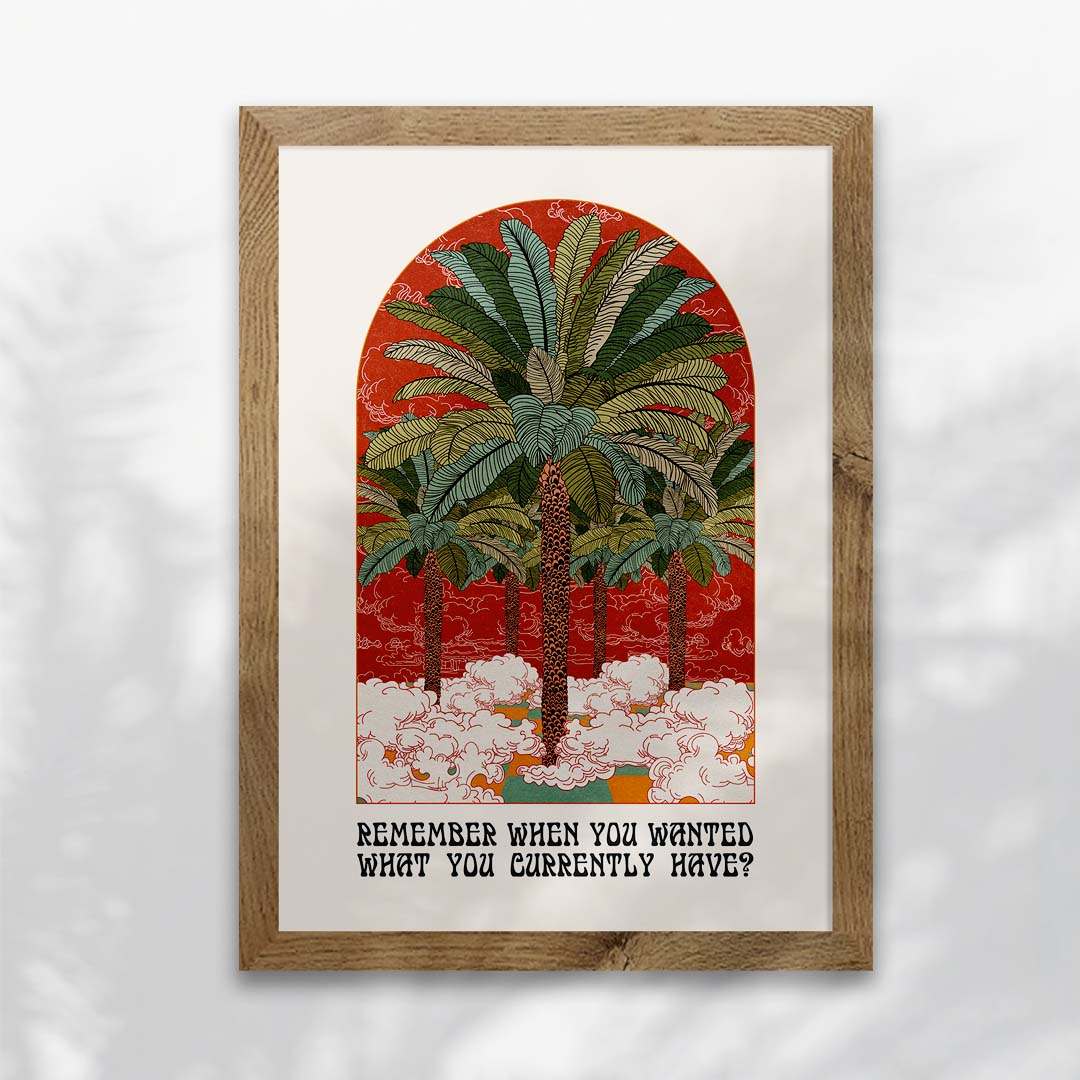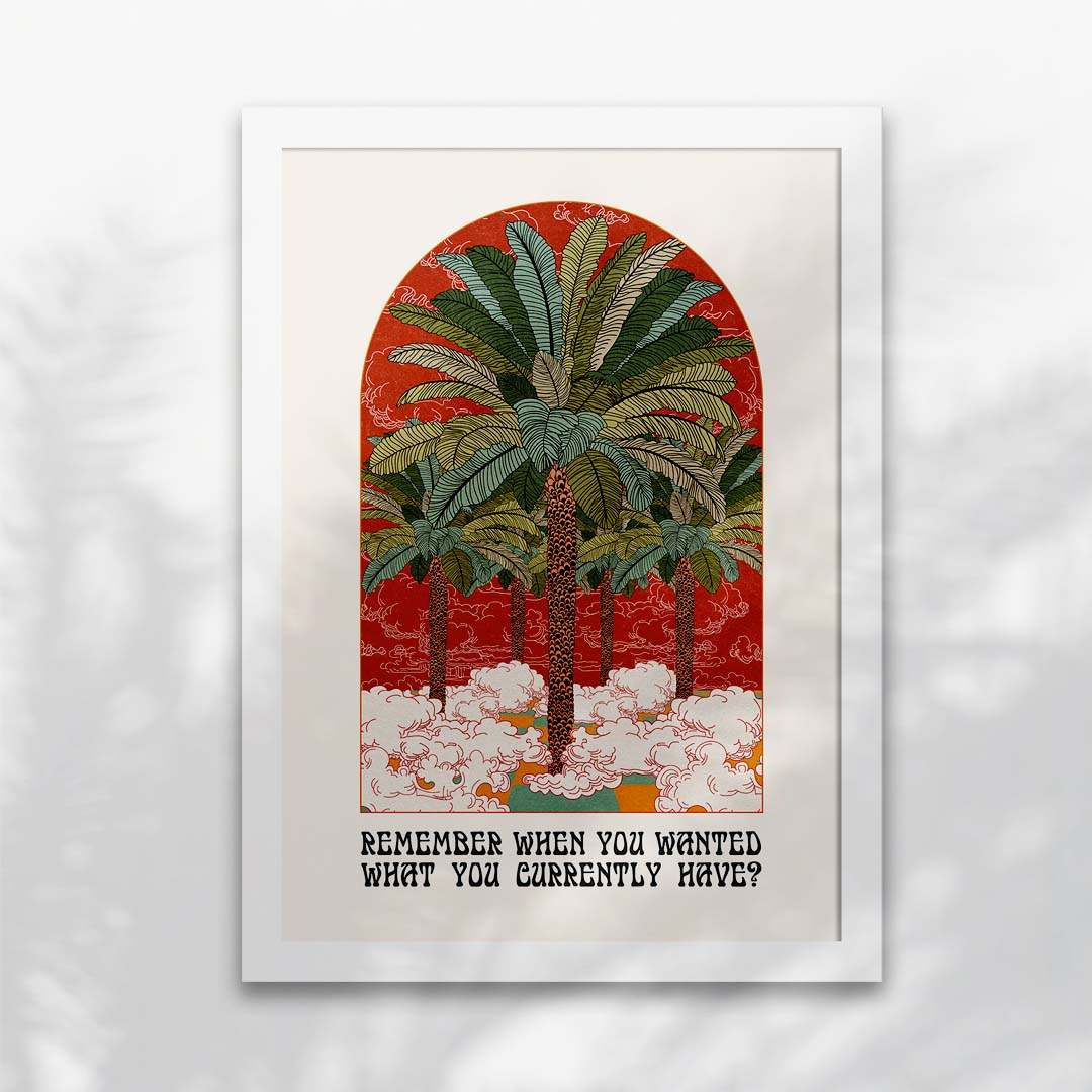 The charming "Remember When" art print features palm trees against a backdrop of dreamy clouds.